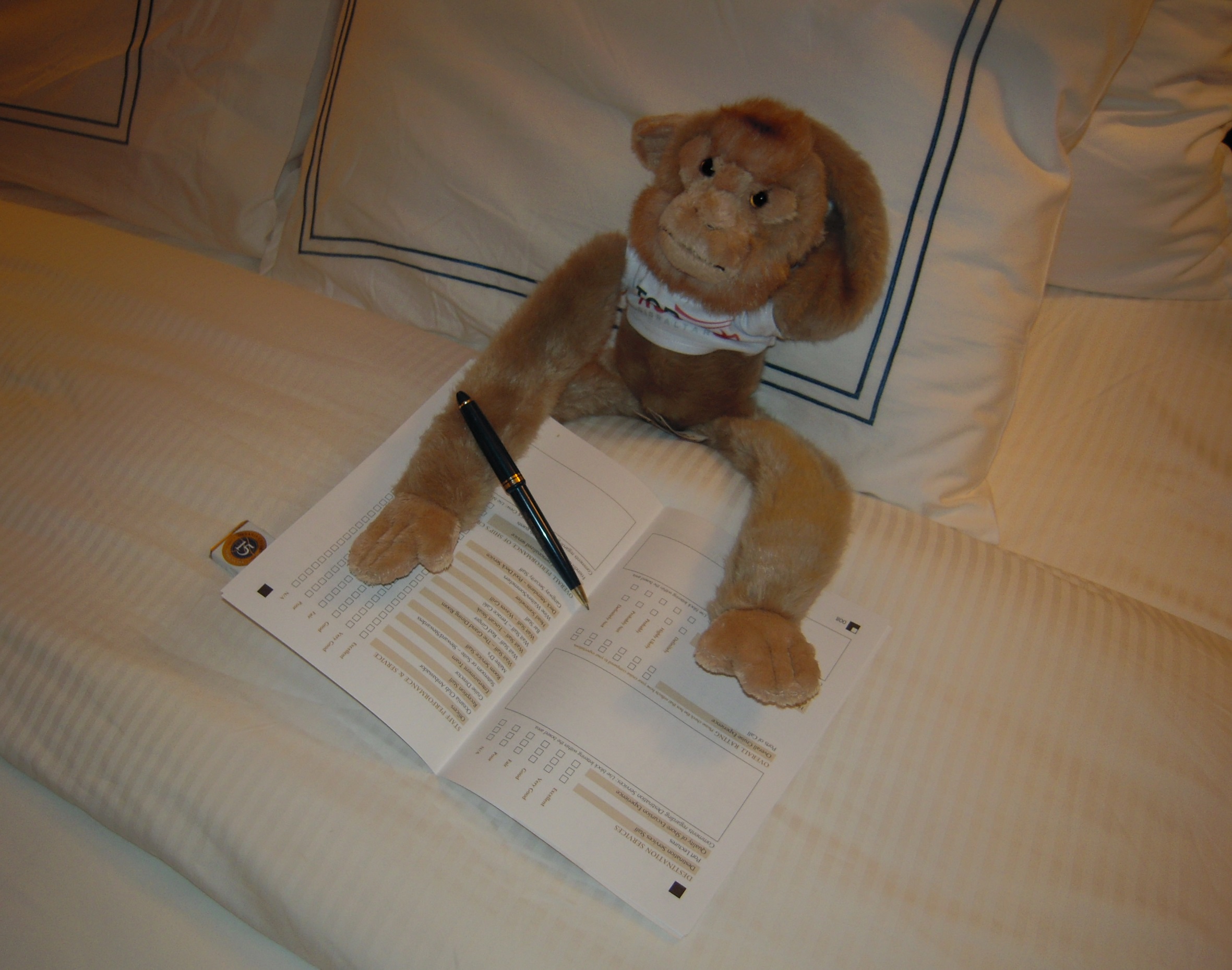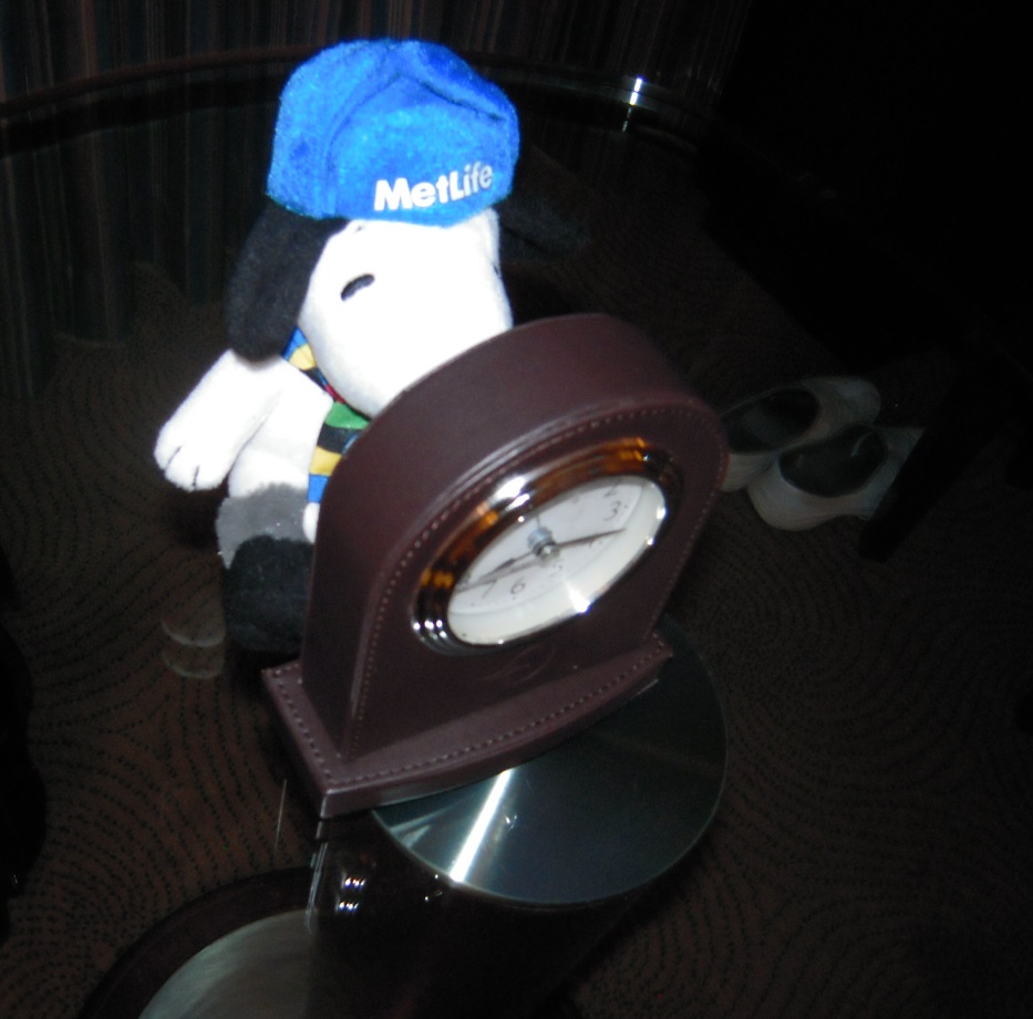 Snoopy was hiding behind a clock on the cabin's glass-top table.