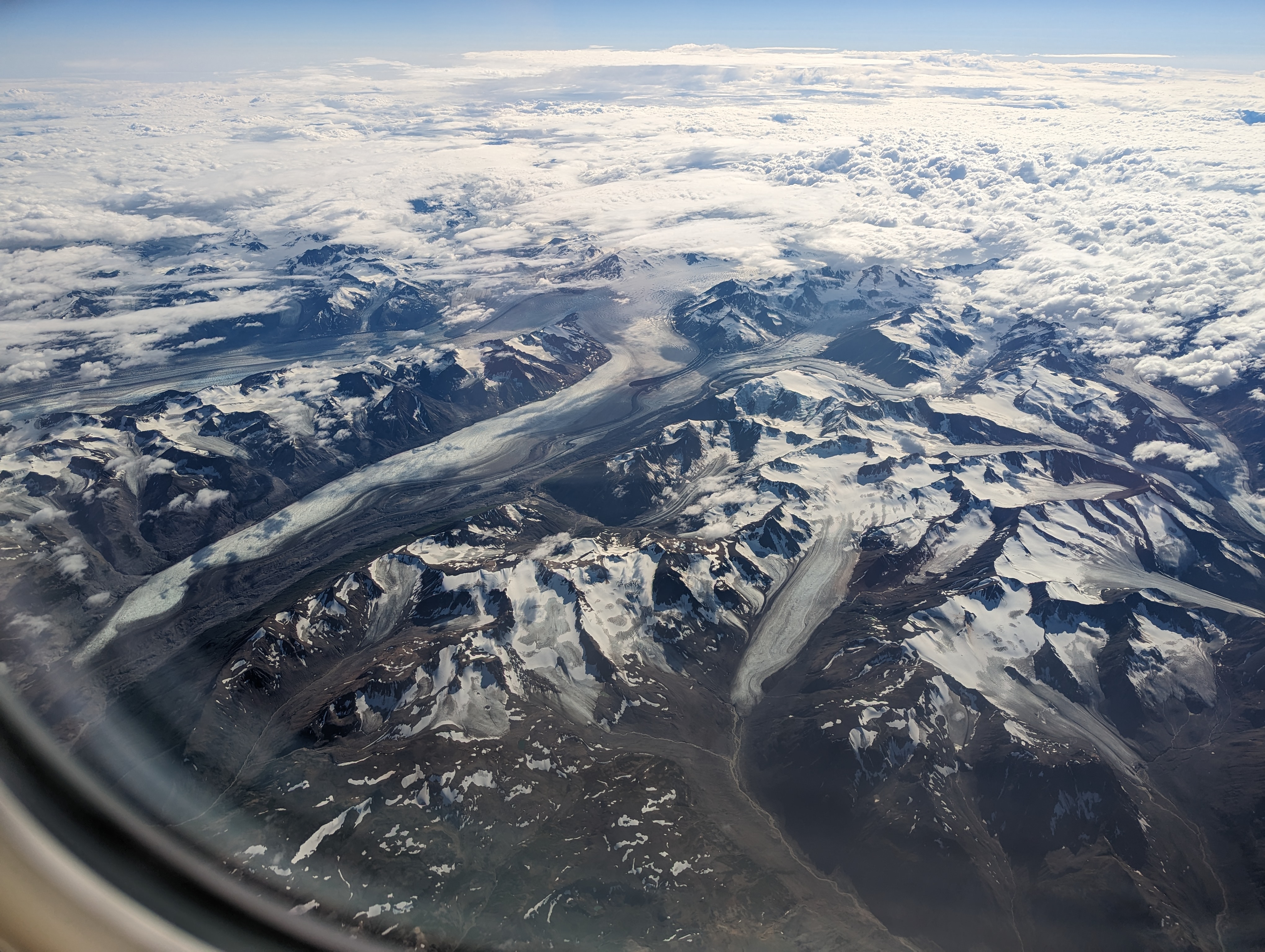 Our last photo of our trip. From our flight south — I have no idea what glaciers these are.