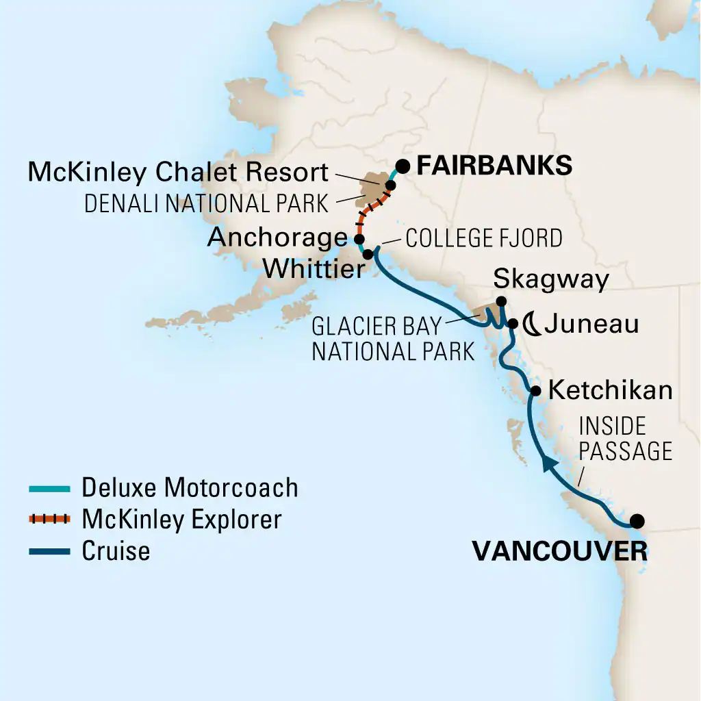from Vancouver to Whittier Alaska,then traveled by motorcoach and train to Fairbanks July 22 - August 7, 2023