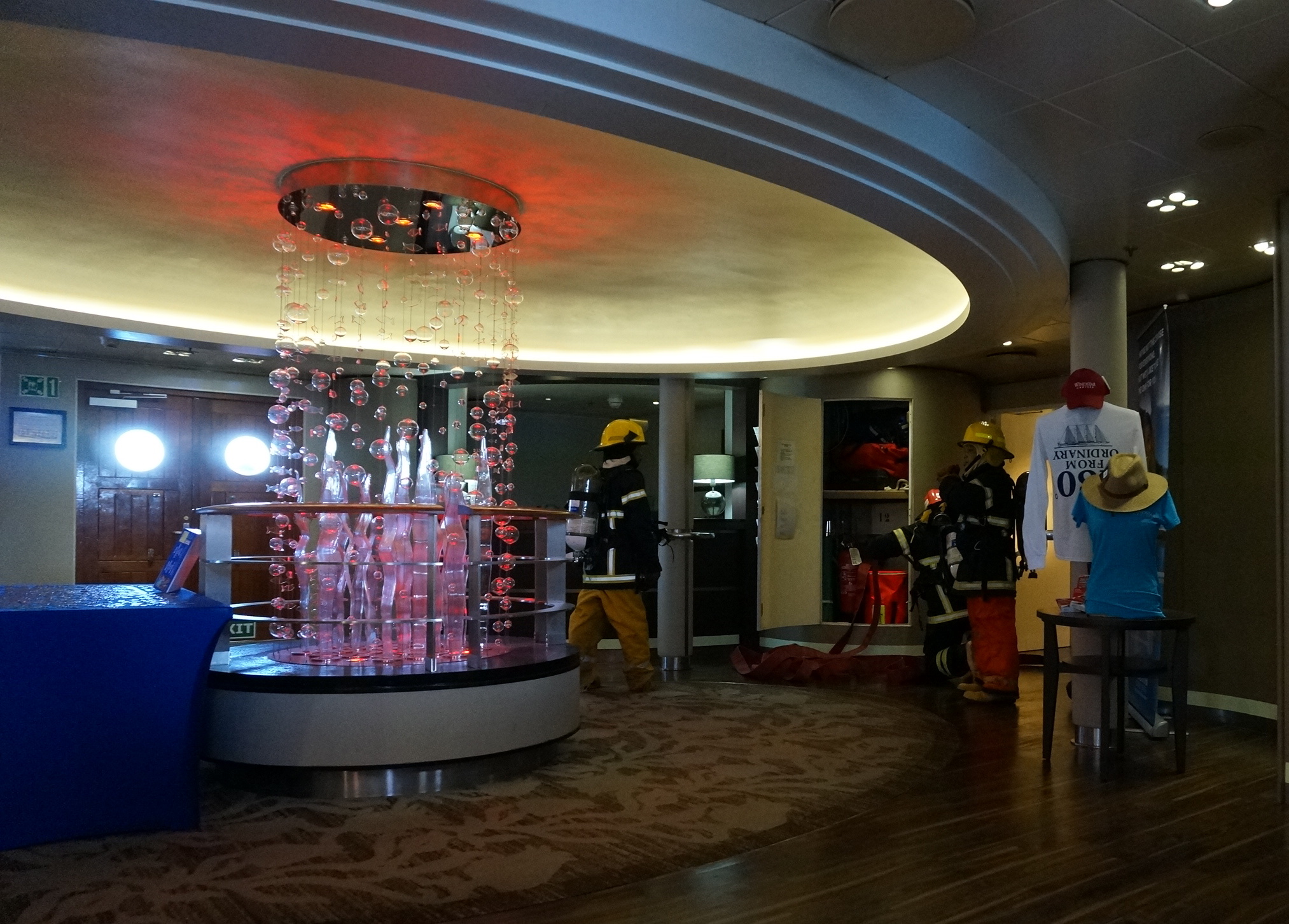 The crew had lots of emergency drills. Look closely, and you'll see crew members in firefighting regalia.