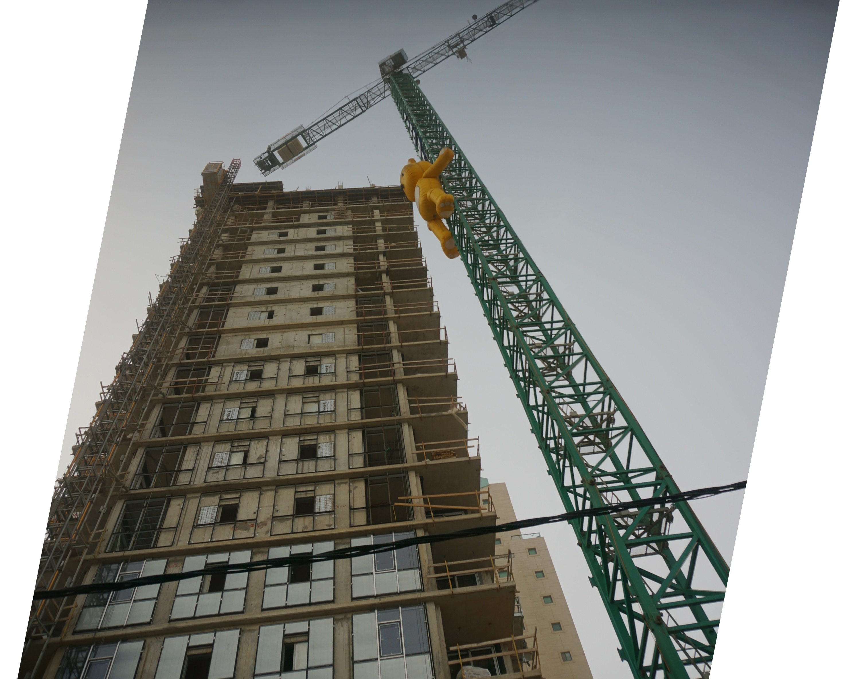 A crane in Tel Aviv had a balloon of a cat clinging to it.