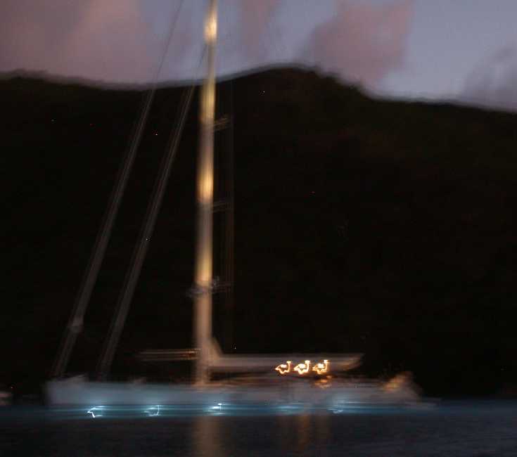 This sailboat ostentatiously lit up the nighttime water with blue lighting.