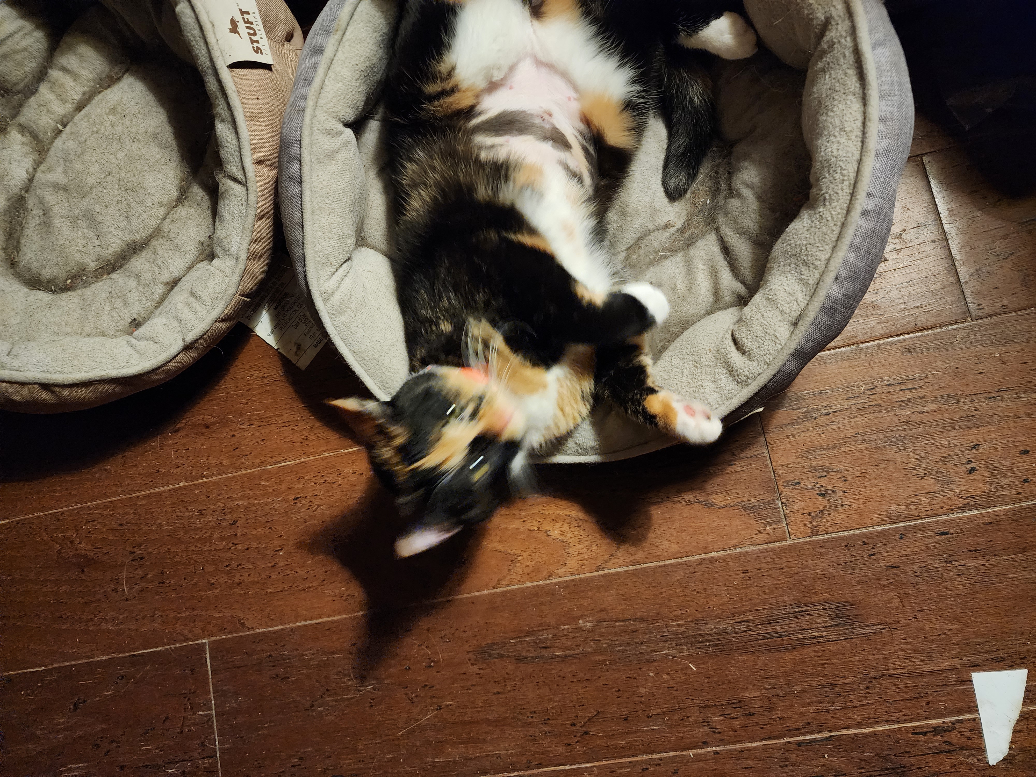 -- Our newest kitty is another calico, whom we've named Shay: at the shelter before we adopted her -- ditto -- closeup of her face -- she rapidly learned to use the cat beds -- she also rapidly learned to climb the cat tree (pictures added February 22, 2023)