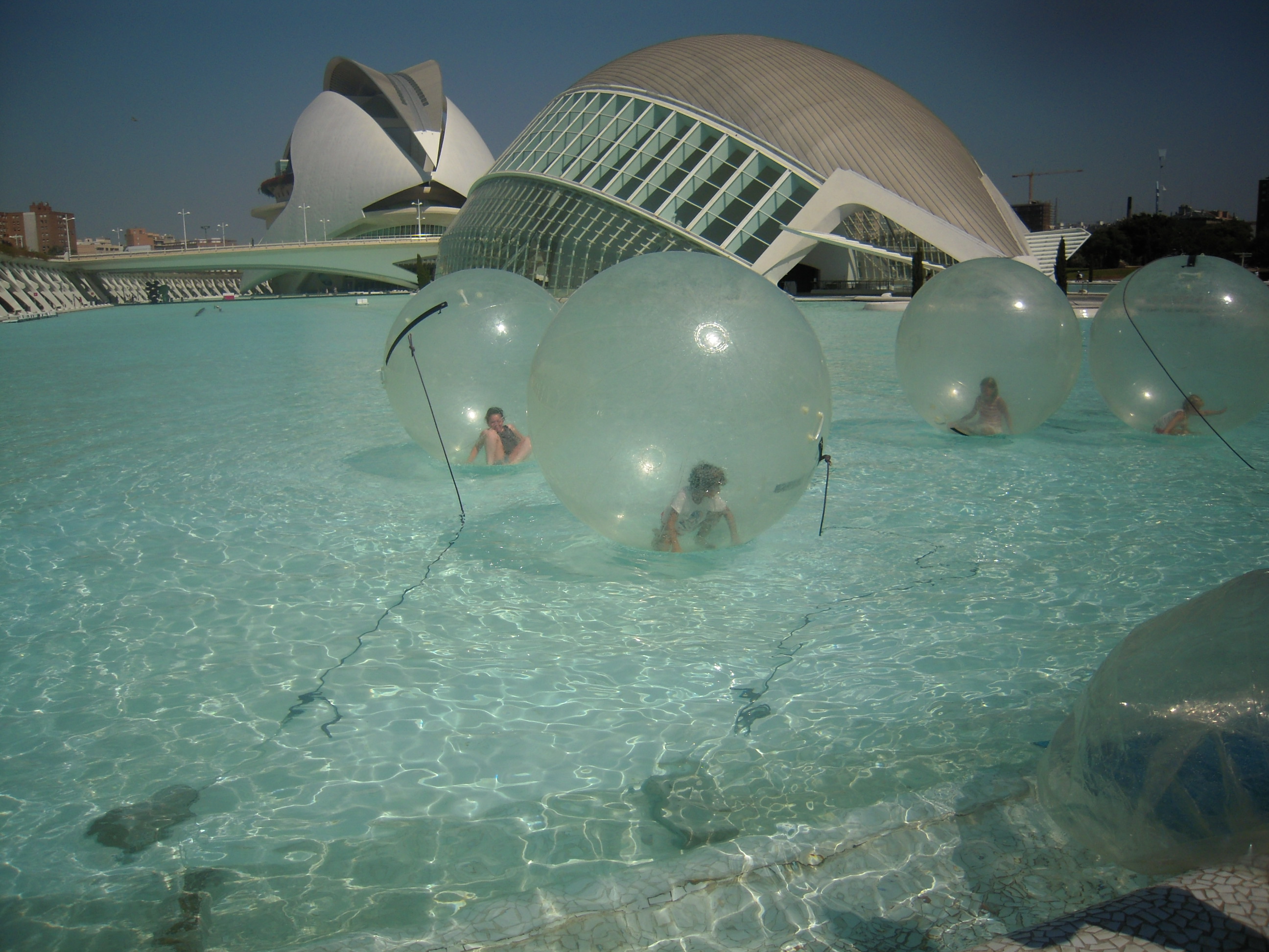 Kids (one kid per bubble) climbed in to a partially inflated bubble at the edge of the pool, the bubble fully inflated, and the kids frolicked inside.