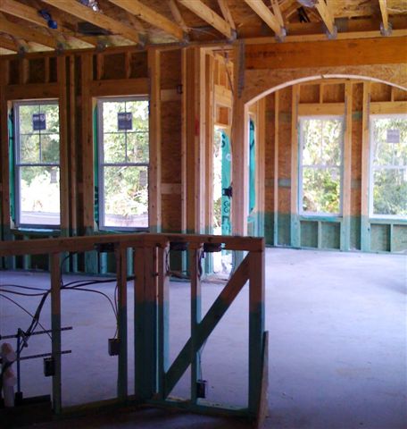 This picture was taken form inside the upstairs bonus room looking through the future doorway. Going right would take you down the stairs. The reason for this picture was to highlight the yellow gas line running inside the wall: very important to know where that is. Currently, there is about 15 lbs of air pressure on your entire gas line to show there are no leaks. We will keep that pressure there during construction so if a pipe is accidentally hit, the pressure will drop and we will know of the penetration.