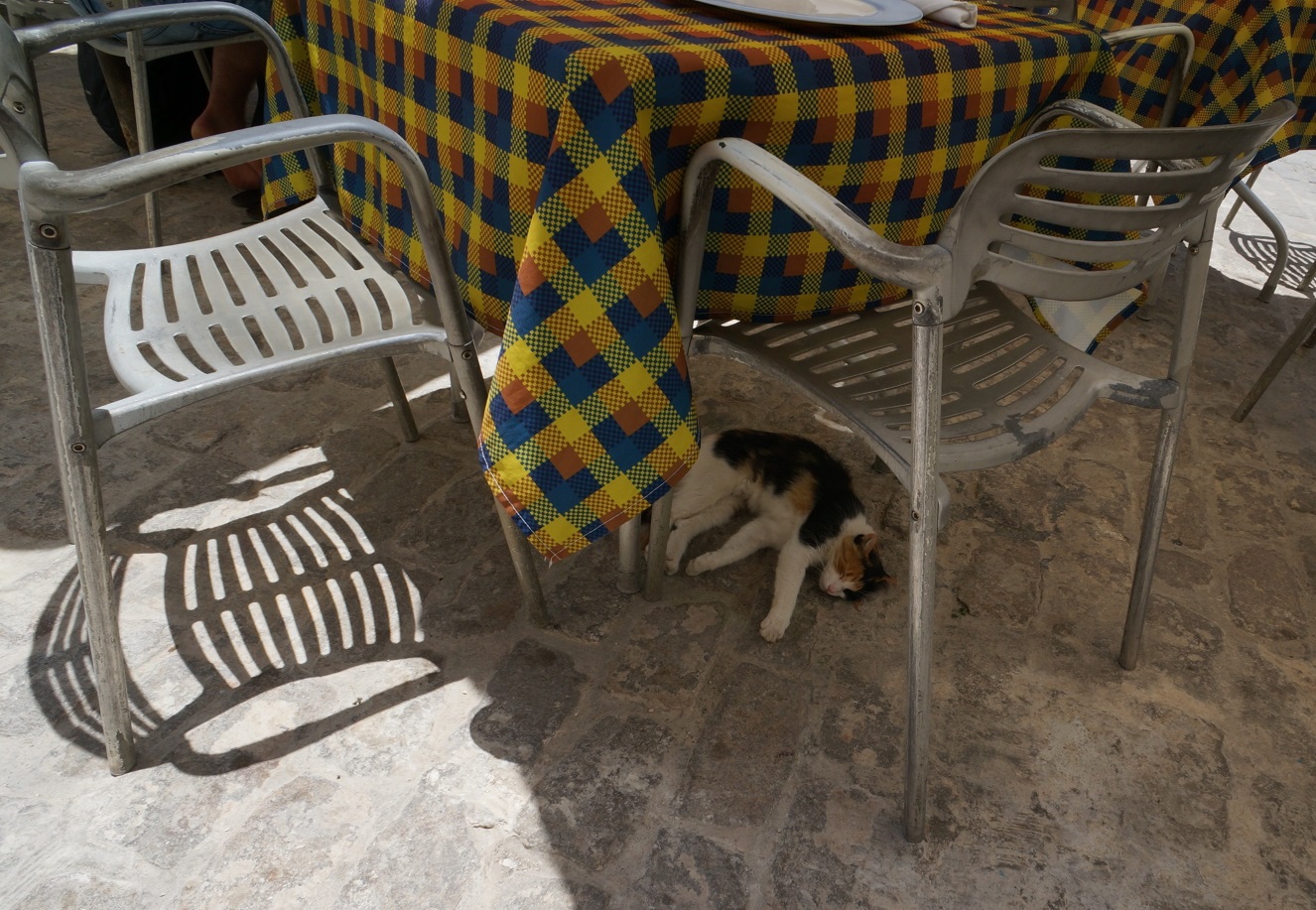 The colors of this snoozing calico kitty didn't exactly match the tablecloth