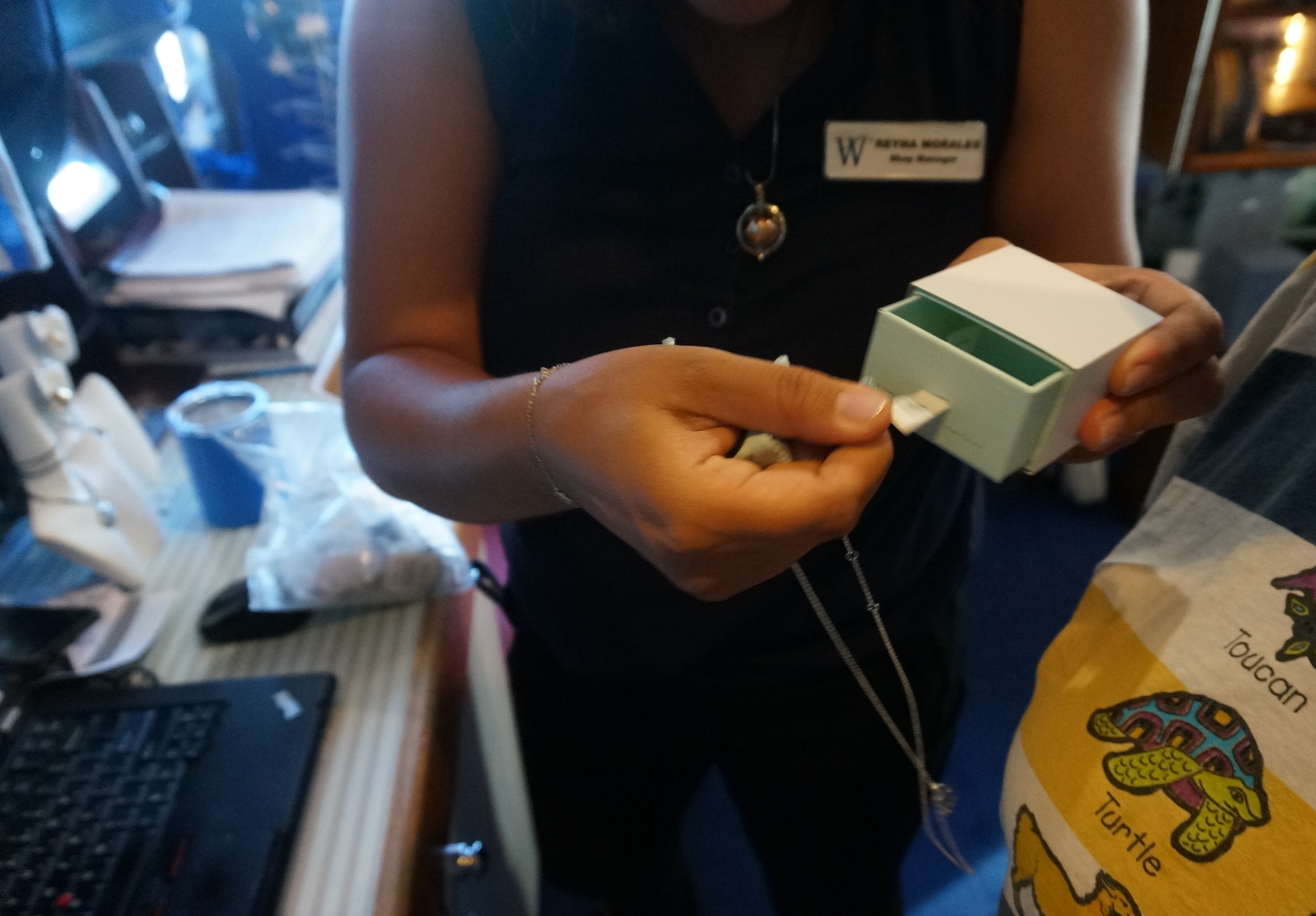 Back on-board, Steph looked at jewelry at the gift shop.