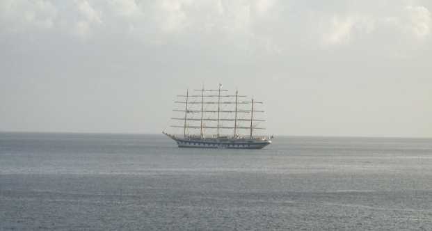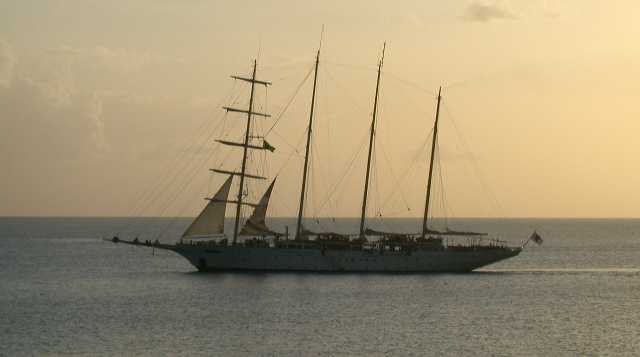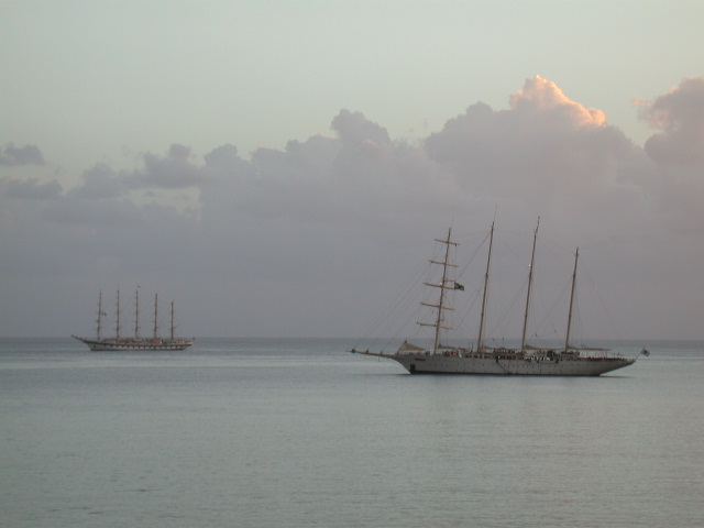 Tall ships at Dominica: Star Clipper (5 masts) and Flying Cloud (4 masts).
