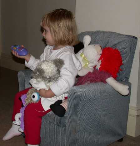 - Josie watching television, holding her own remote control, in her own recliner