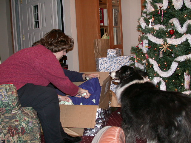 Jen unpacking a present with Duncan ready to help