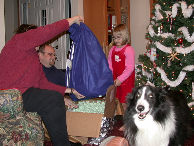 Duncan gave up, but Russ and Josie were eager to help (it was an electric blanket, wrapped in a very blue bag!)