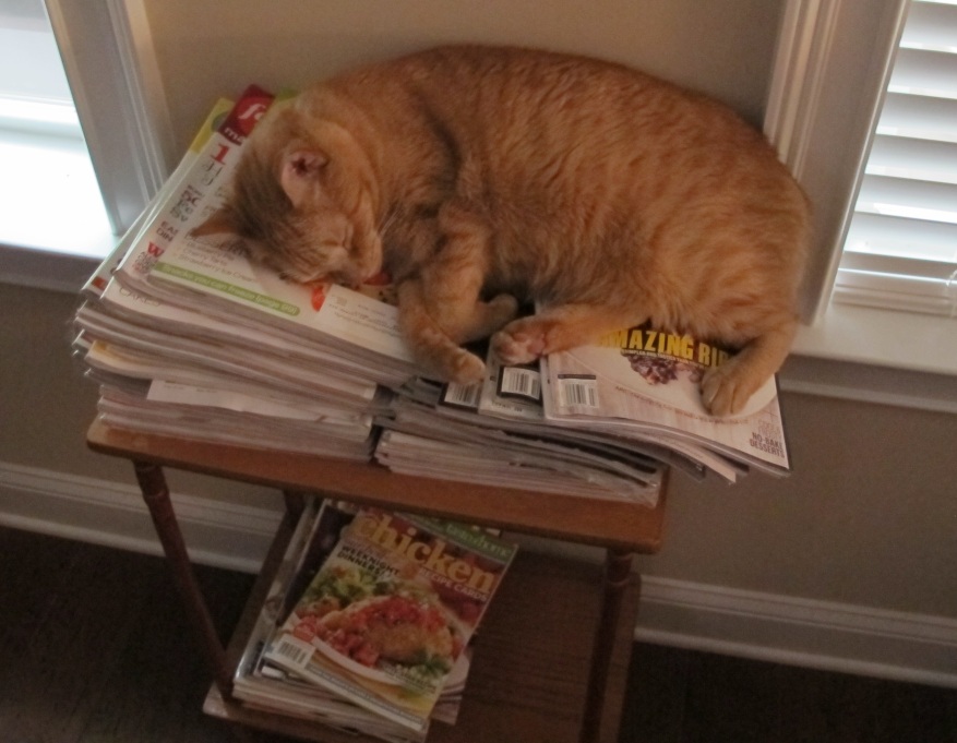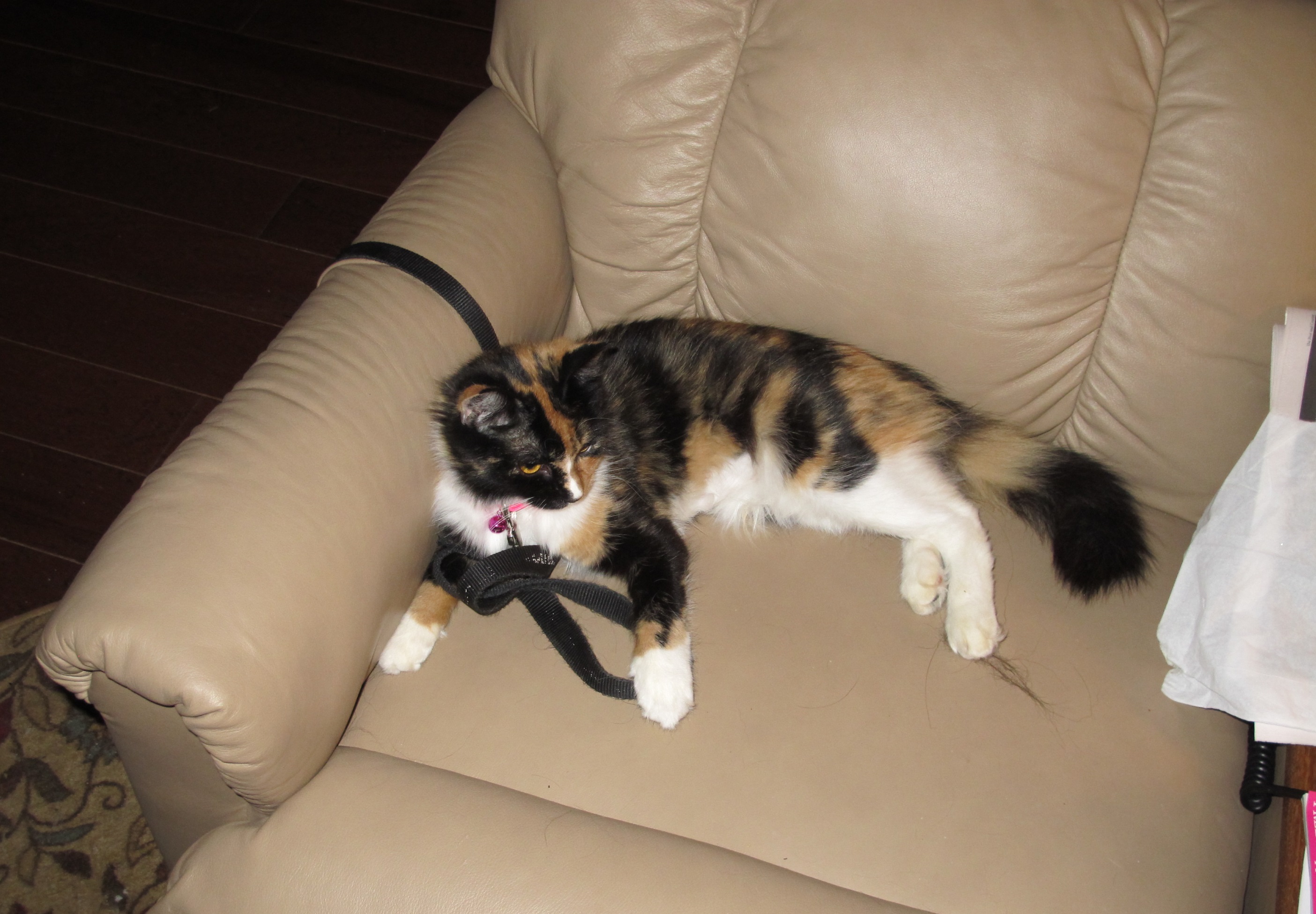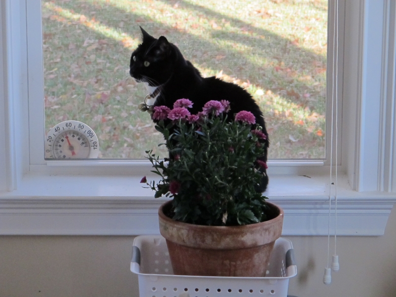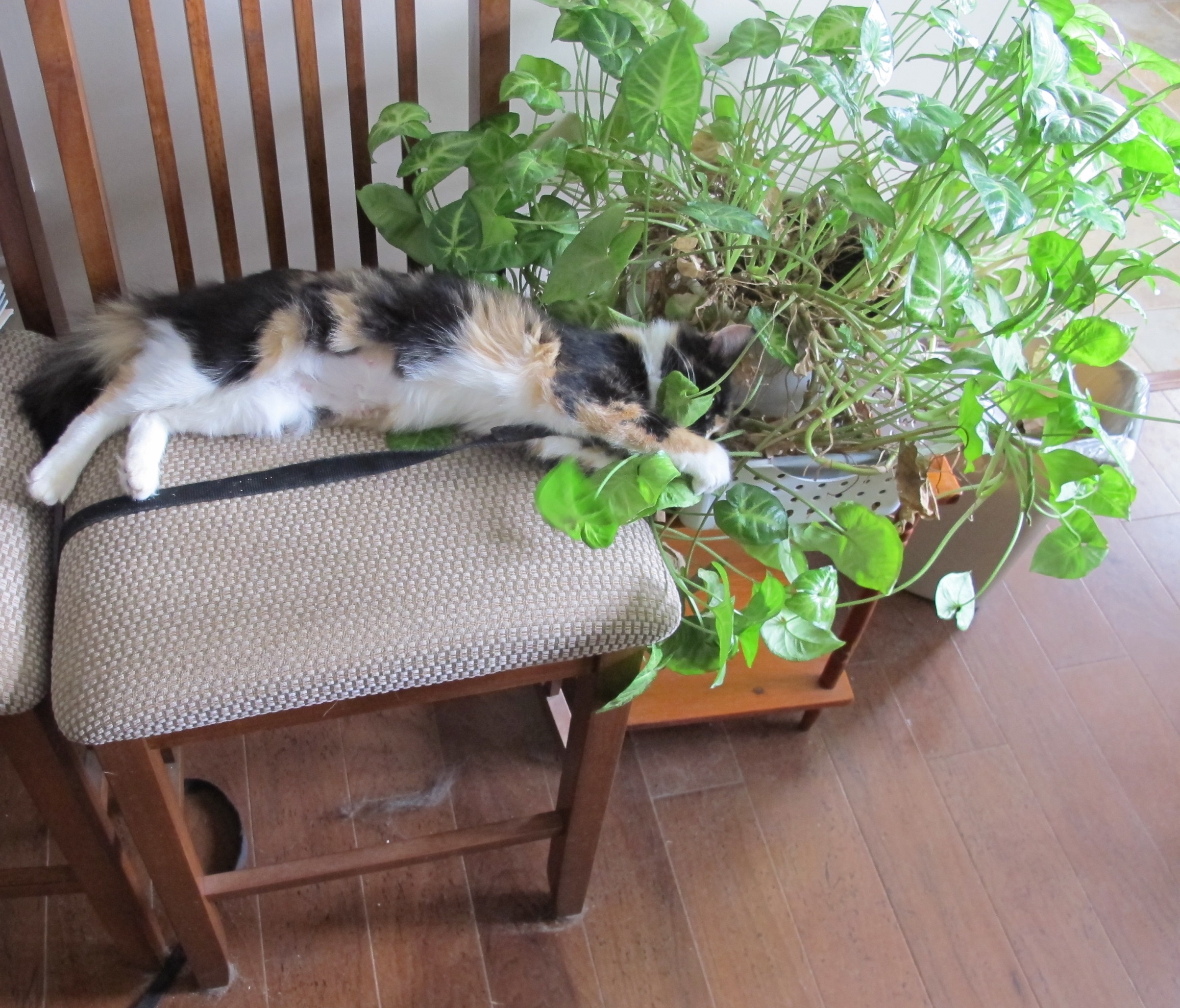 -- Our newest kitty is a calico we've named Smooch: On HER chair -- Why are YOU looking at ME? -- Catnapping on her OTHER chair -- Smooch the gardener trimming one of HER plants(October 14, 2014)