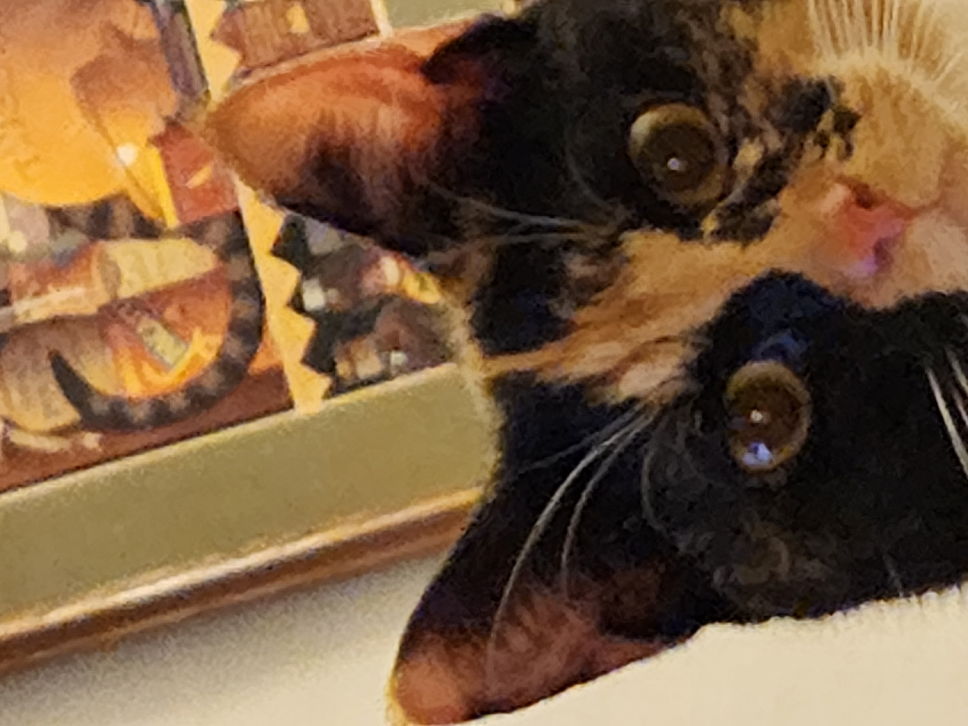-- Our newest kitty is another calico, whom we've named Tsel ("shadow" or "shade" in Hebrew): Tsel at her previous home, the Pounce Cat Cafe another photo at Pounce (April 20, 2021) -- Coming out of hiding -- Resting -- Smooch (on the chair) and Tsel (on the floor)(April 2021)