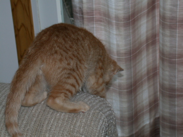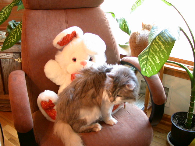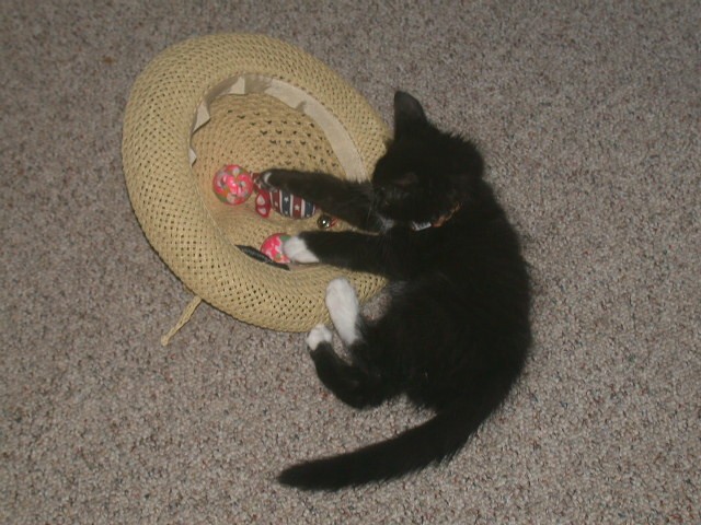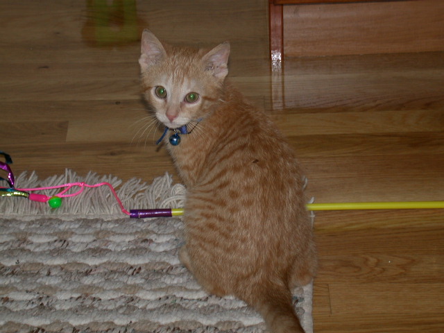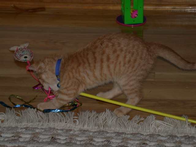 -- Our new kitty: Miranda: Playing with her catnip-fish-on-a-stick toy: -1- -2- -3-Getting ready to fly off the couch: -4-. With Katie: -5-. -6-. -7-. -8-. (May 22 &23, 2004)