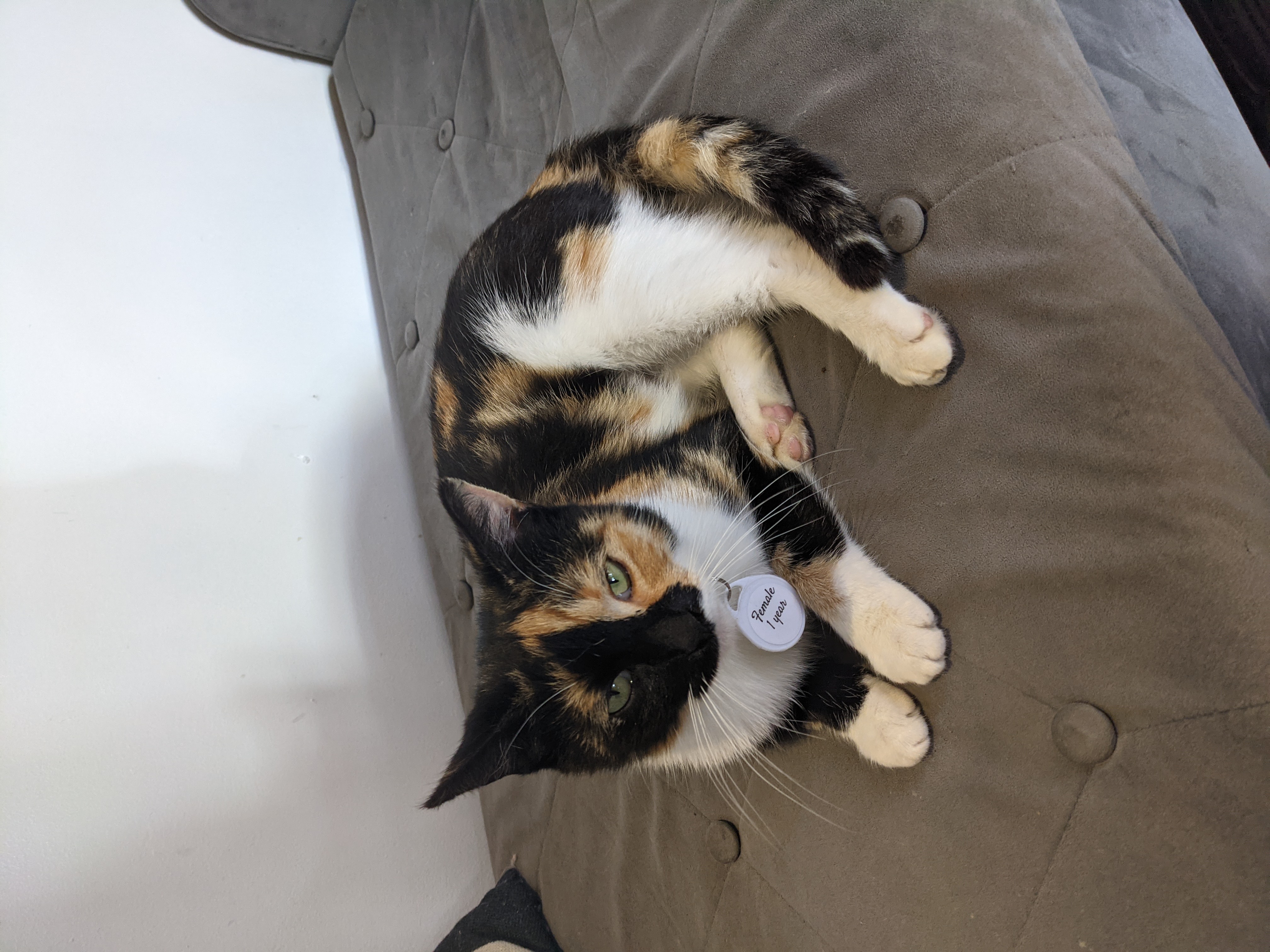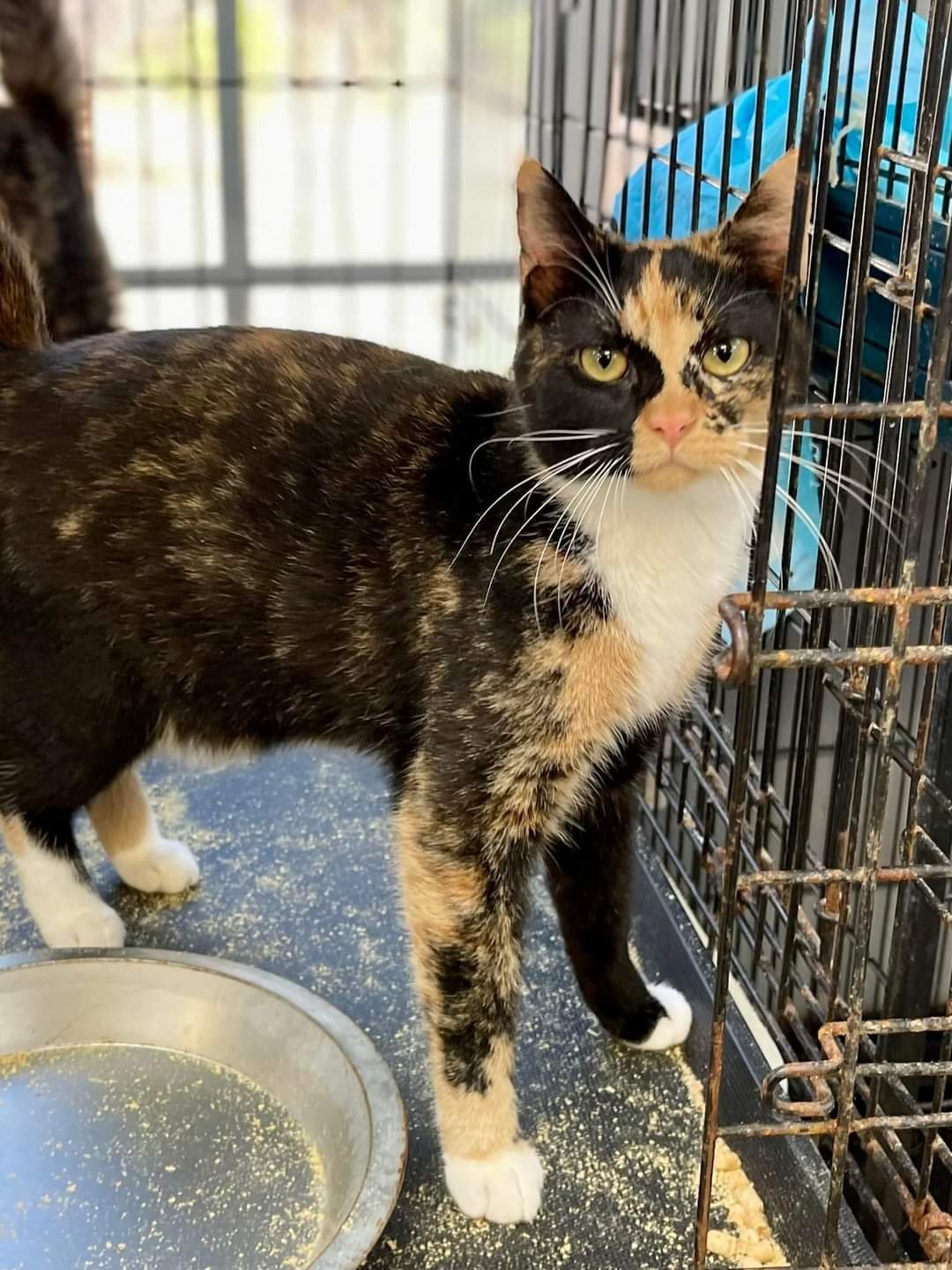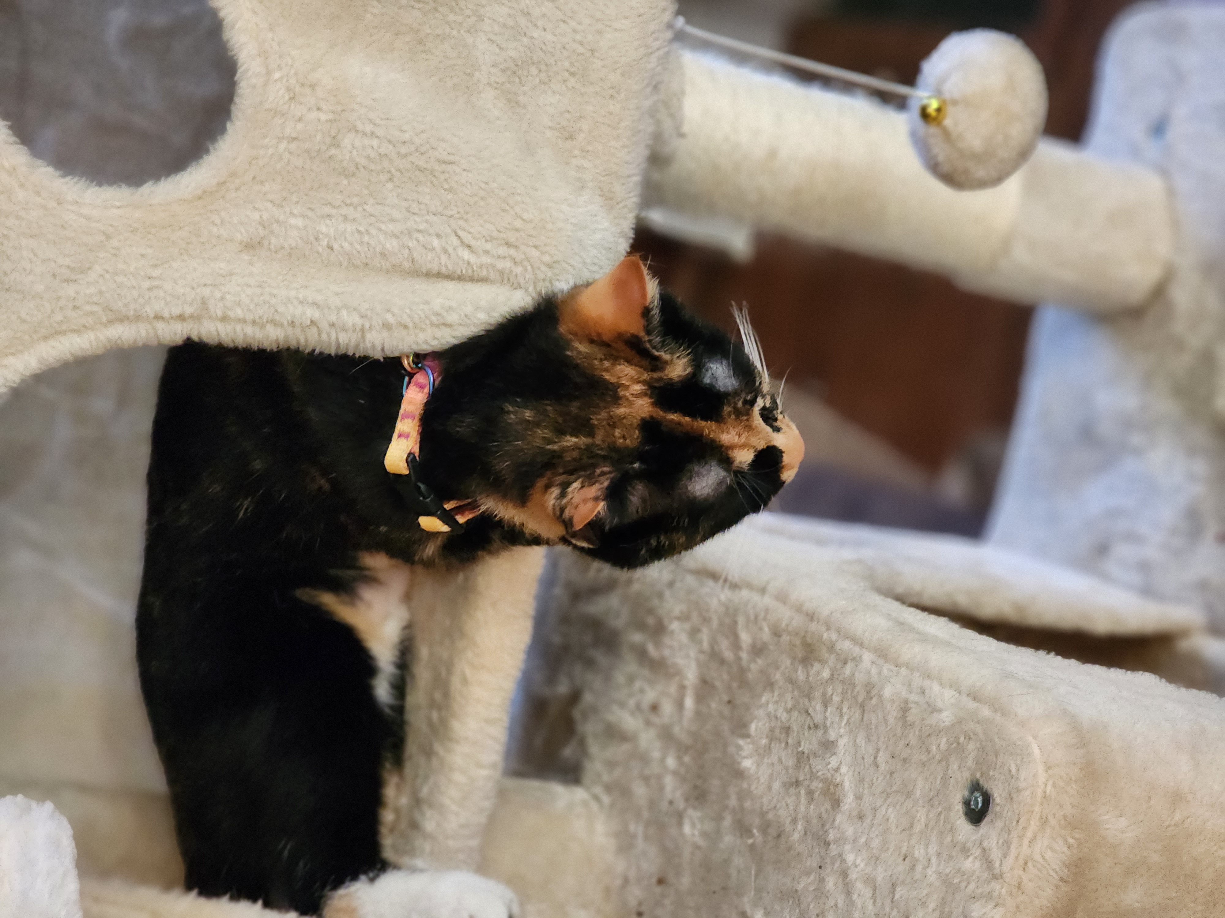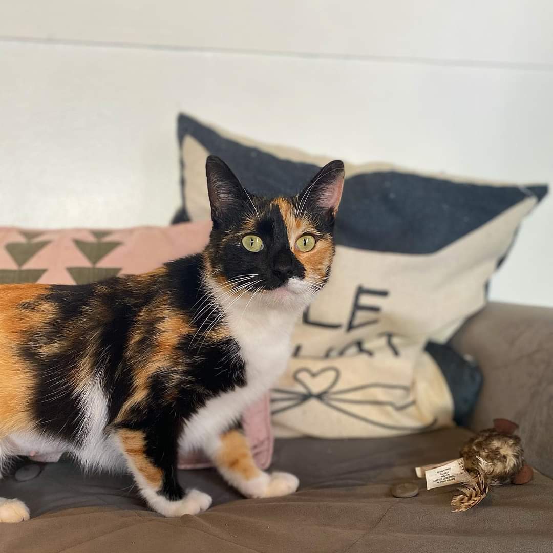 -- Our newest kitty is another calico, whom we've named Shay: at the shelter before we adopted her -- ditto -- closeup of her face -- she rapidly learned to use the cat beds -- she also rapidly learned to climb the cat tree (pictures added February 22, 2023)