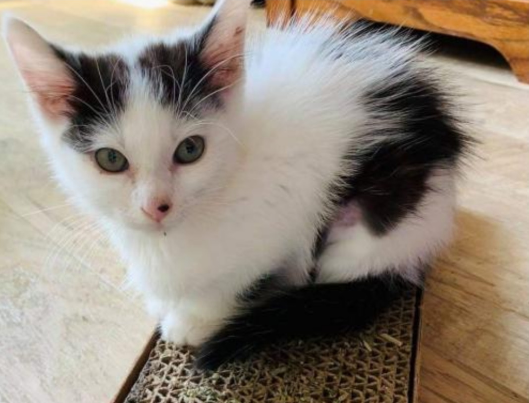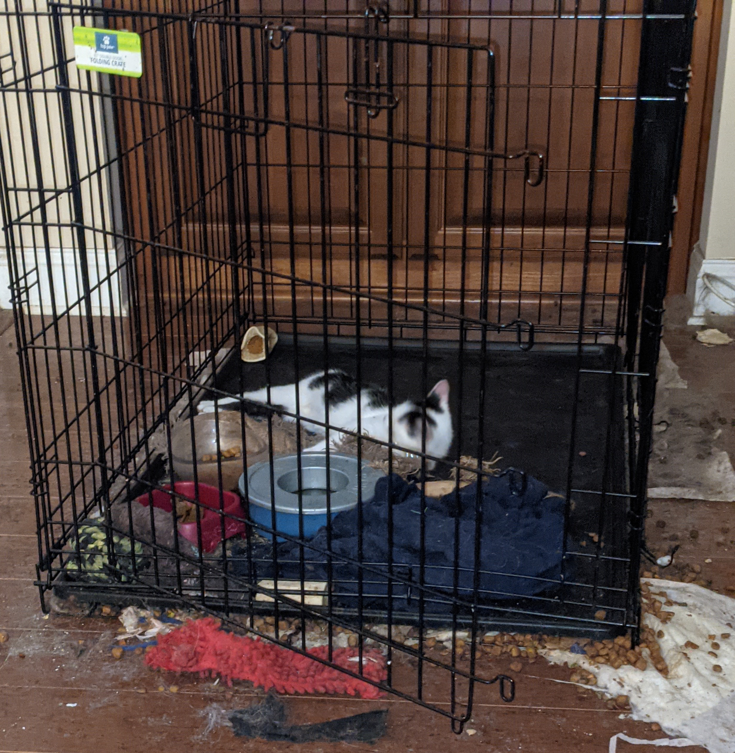 -- Our newest kitty is a black and white, whom we've named Shira (a Hebrew feminine given name meaning "poetry", "singing" or "music"): itty bitty kitten -- growing rapidly -- she loves the dawg's crate (pictures added September 25, 2021)