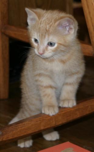 -- Our new kitty: Miranda (previously known as Muffin). This photo is at the foster-kitten home with her siblings, when she was growing up enough to be relocated to our menagerie. (April 2004)Katie: