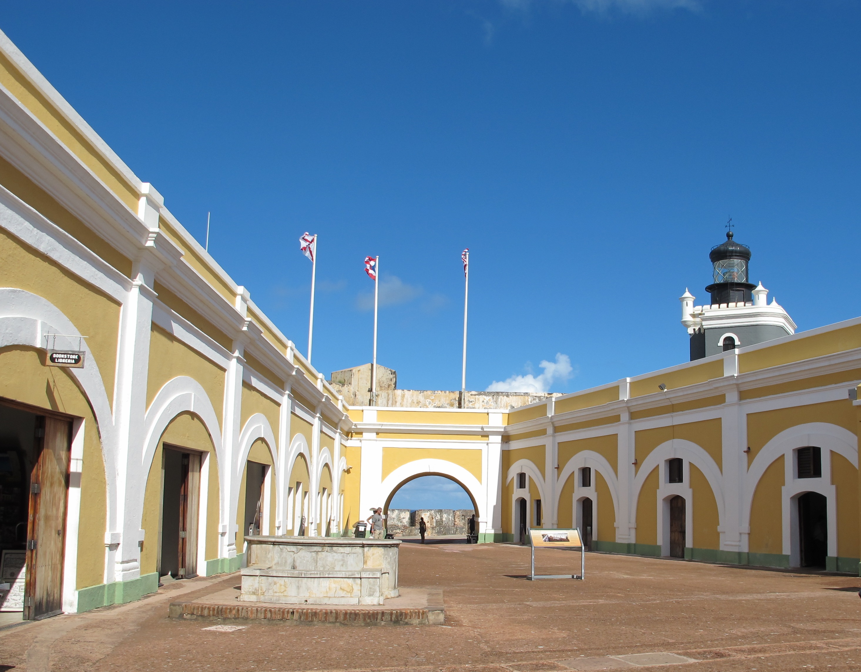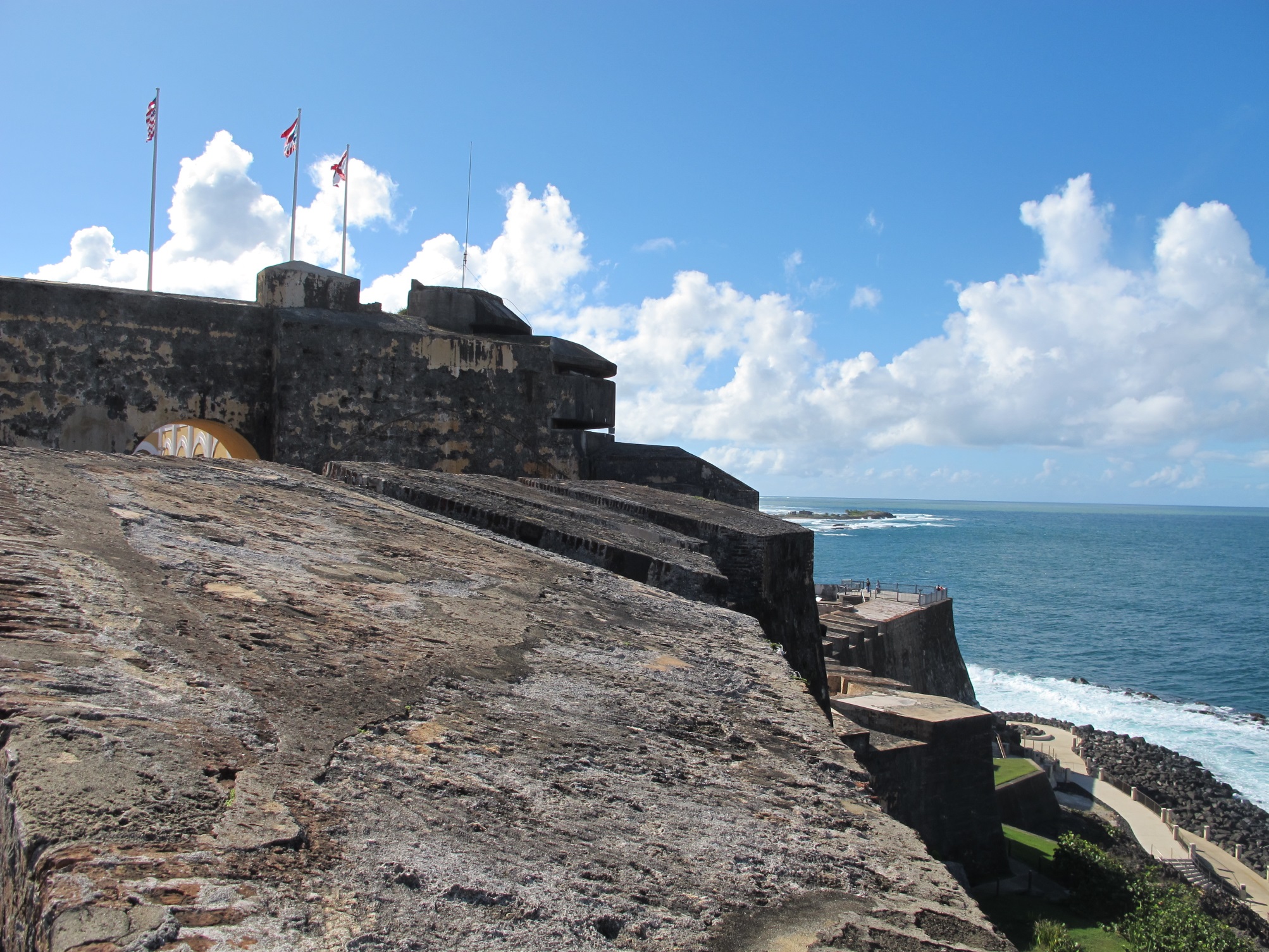The flags of the US, Puerto Rico, and the Spanish flag that flew over El Morro for several hundred years.![]()