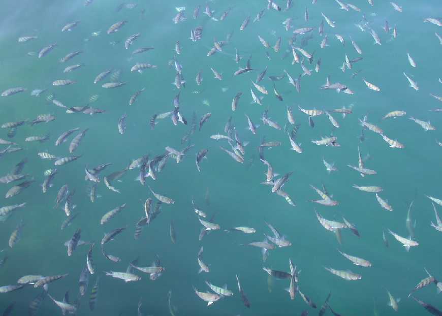 When we anchored for snorkeling, the mate threw some fish food overboard, and attracted thousands of small, darting, silvery fishes.